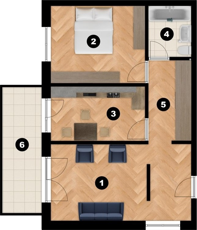 1. Living - 20,38 mp; 2.Dormitor - 12,63 mp; 3.Bucătărie - 9,49 mp; 4.Baie - 4,50 mp; 5.Hol - 6,36 mp; 6.Balcon - 9,60 mp